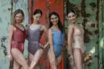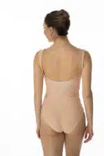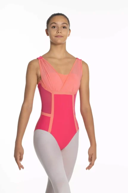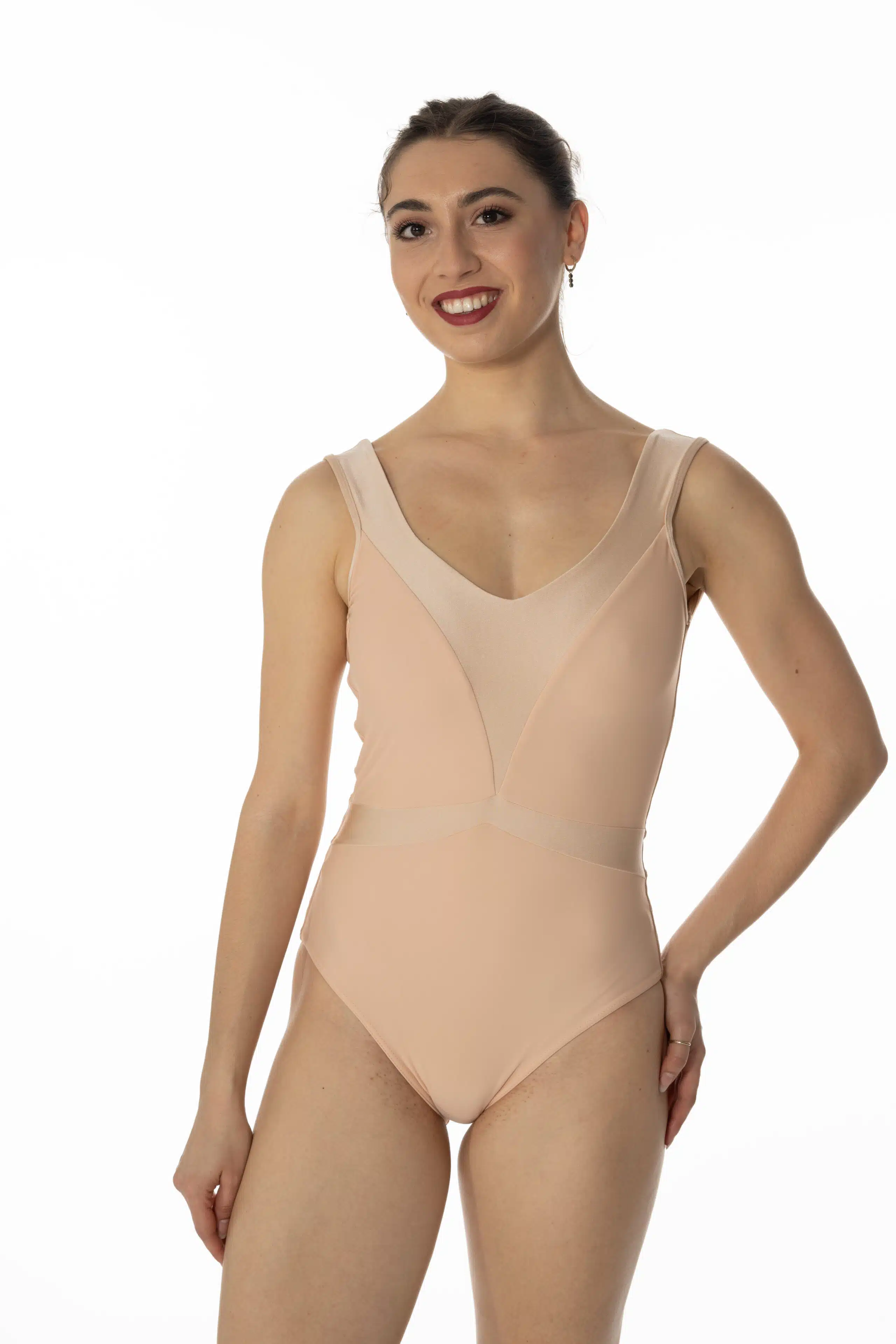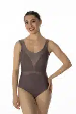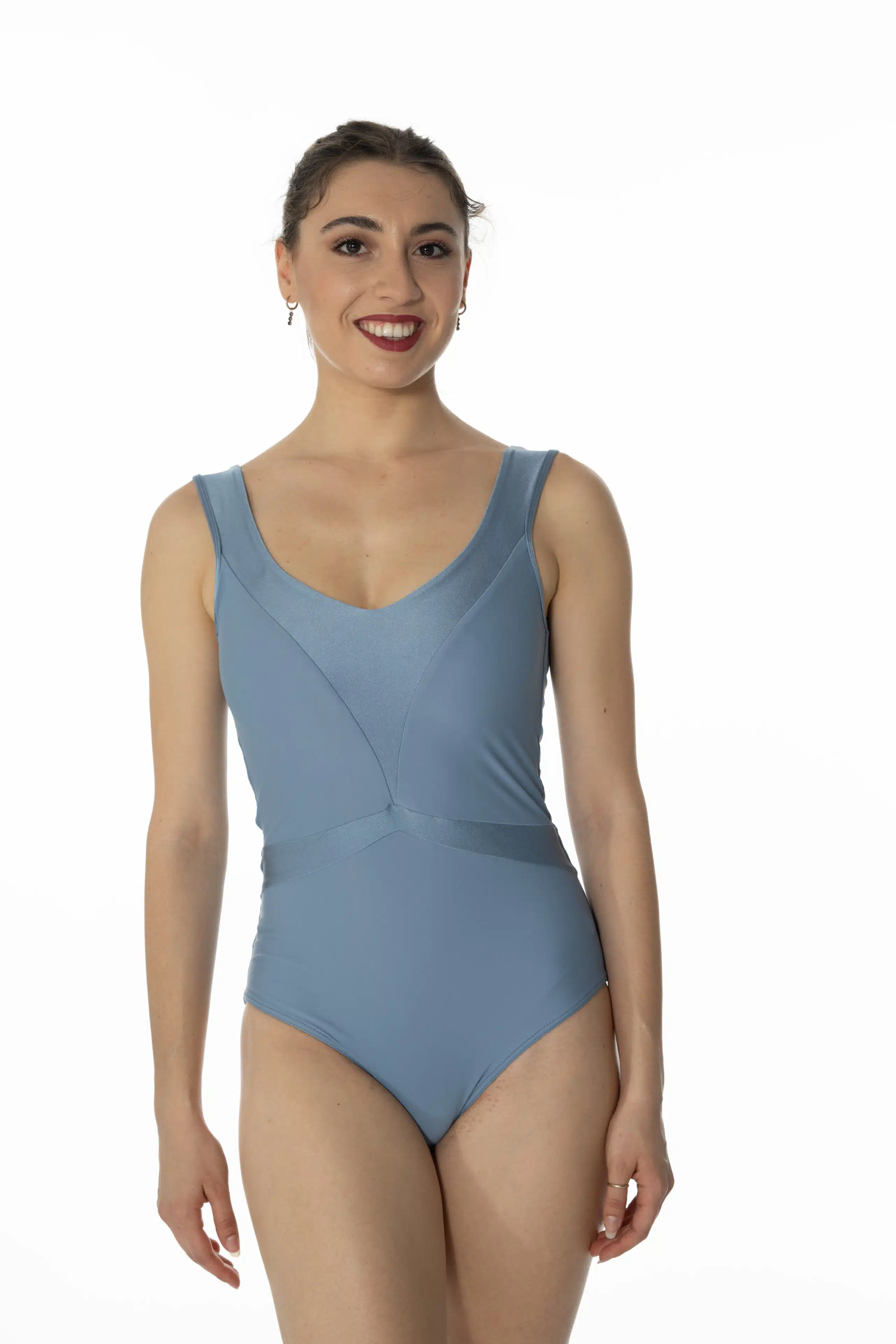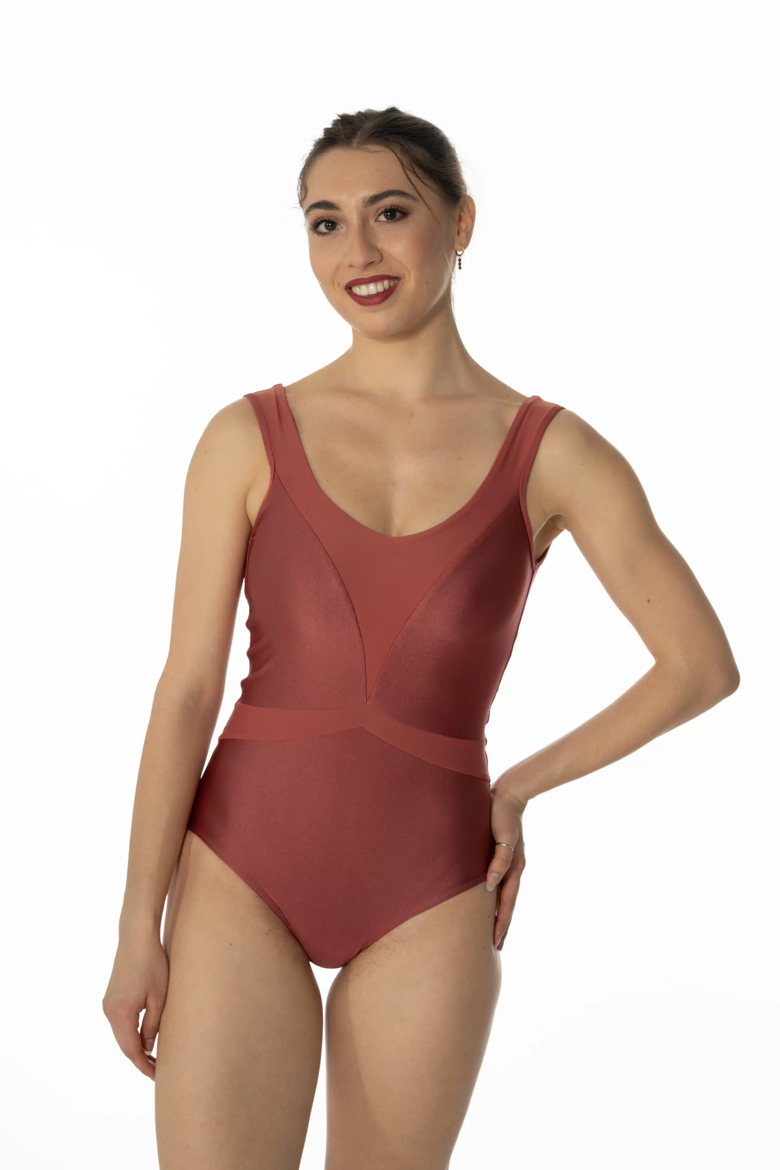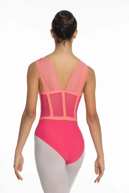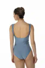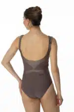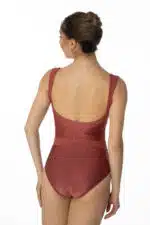 Justaucorps entièrement doublé, sculptant la silhouette par un jeu de découpes et un subtil mélange d’un lycra mat et d’un lycra brillant ton sur ton labélisé OEKOTEX.