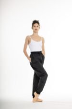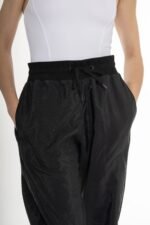 It is tightened at the waist and ankles by a 1×1 rib edge.